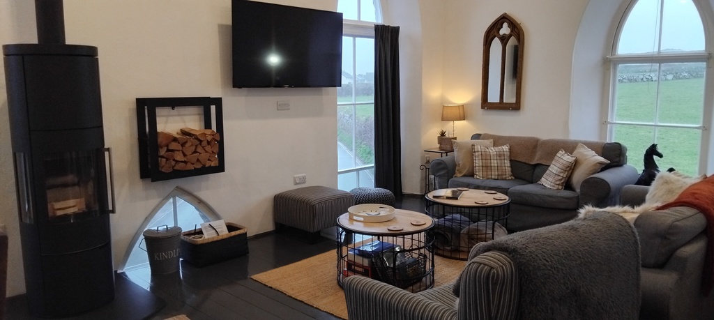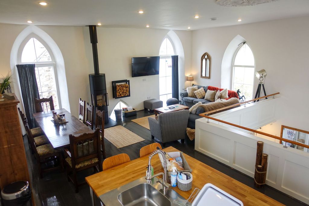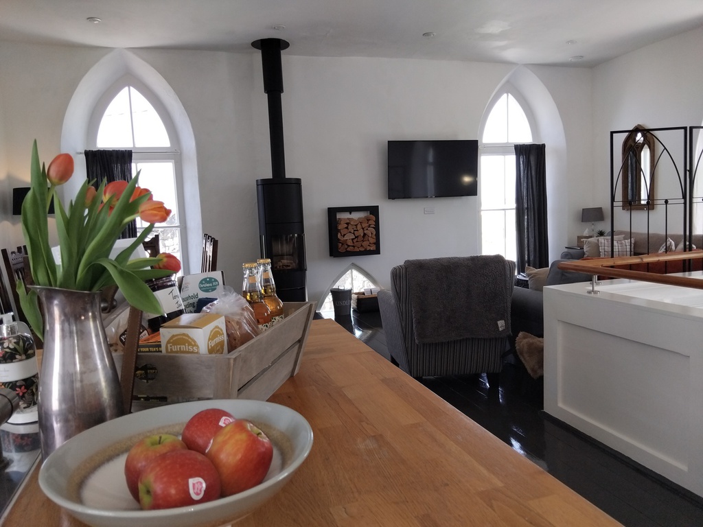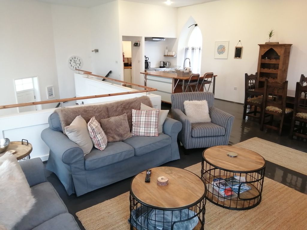 St Just. The property in entered via a rear door opening to the staircase and pulpit. The converted chapel on two floors is light & airy offering spacious open plan living with lounge, kitchen
