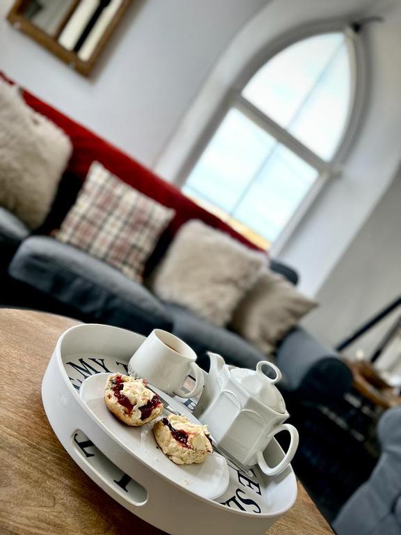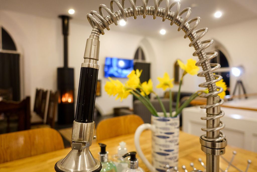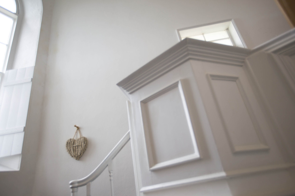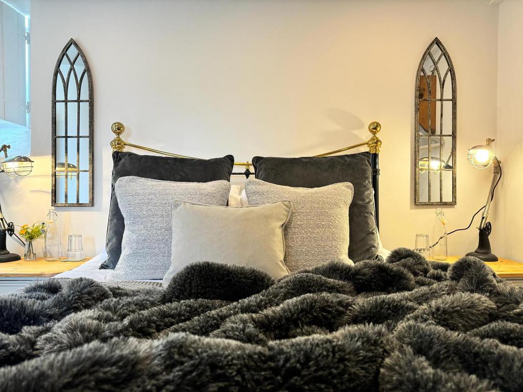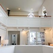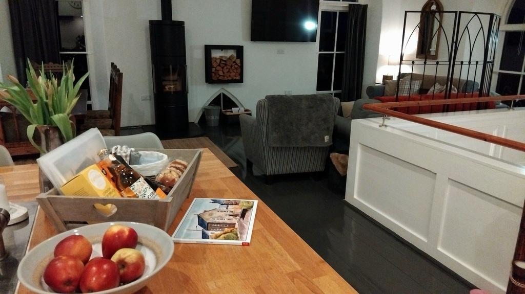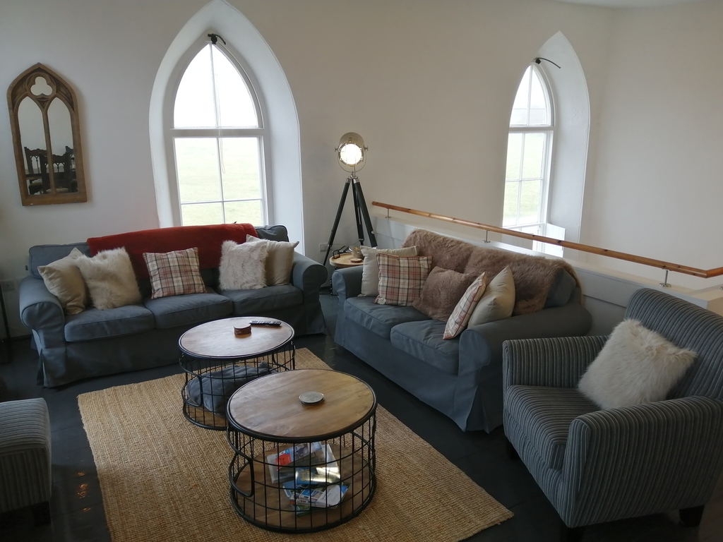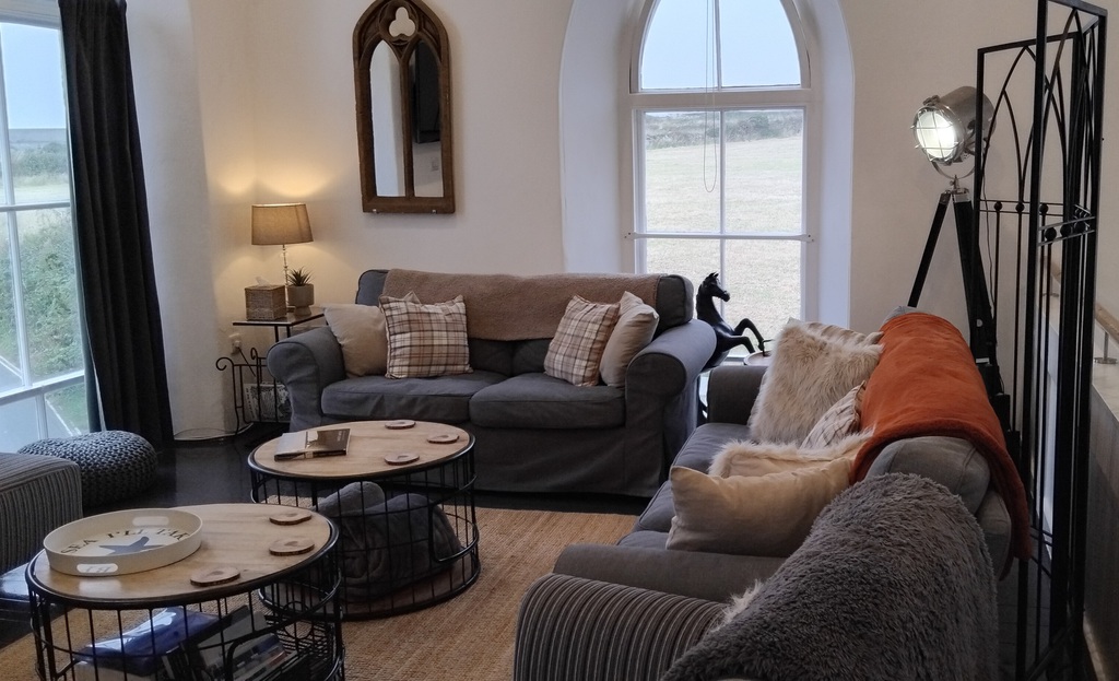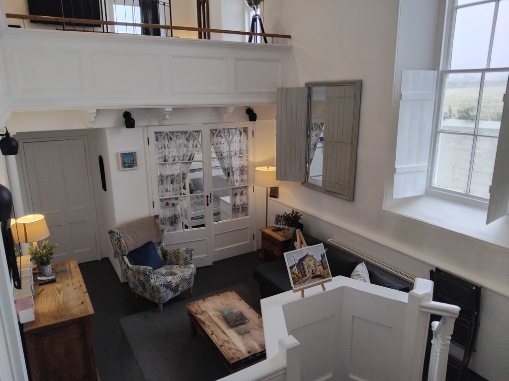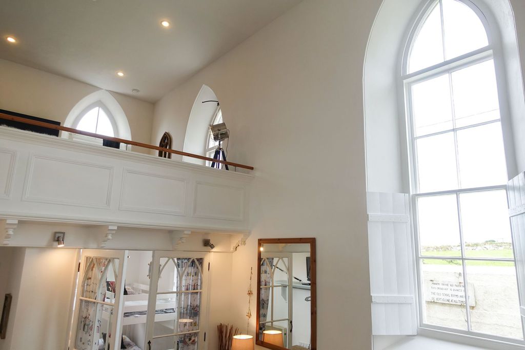 and dining area to the upper level, with distant sea views from the large Gothic style windows. A panelled balcony overlooks the lower living room with modern sofa bed and off the lounge are two